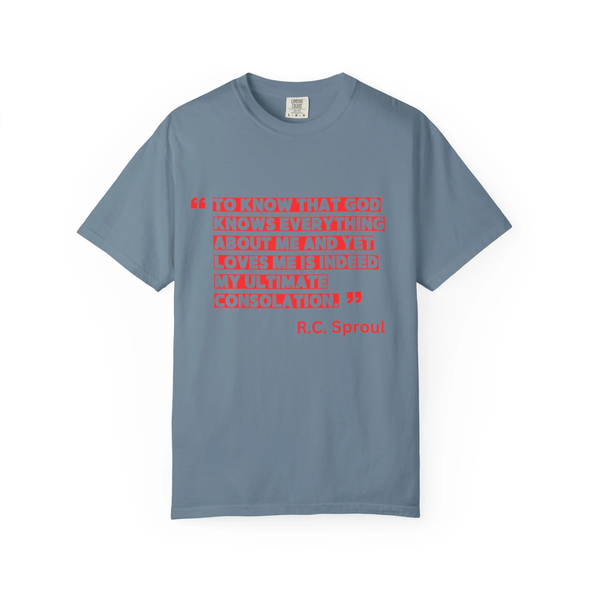 A garment-dyed cotton tee that reads like a quiet declaration. The soft, broken-in fabric and muted cream tone let the coral block-letter quote take center stage: a reflective line from R.C. Sproul set in stacked, modern type. Wear it solo with jeans on Sunday morning or layered under a cardigan for study group nights. The tee feels lived-in from the first wear — breathable, substantial, and relaxed — so the message comes across as personal, not preachy. It’s for people who value thoughtful words and understated style, for times of contemplation, conversation, or comfort after a long day.